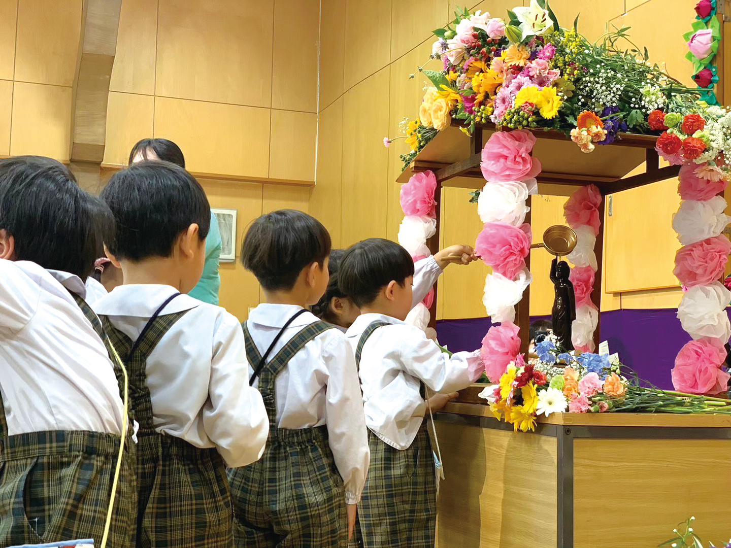 | 花まつり参観 園ではお釈迦様の誕生日を祝う花まつりを1ヶ月おくれで、おまつりします。 |