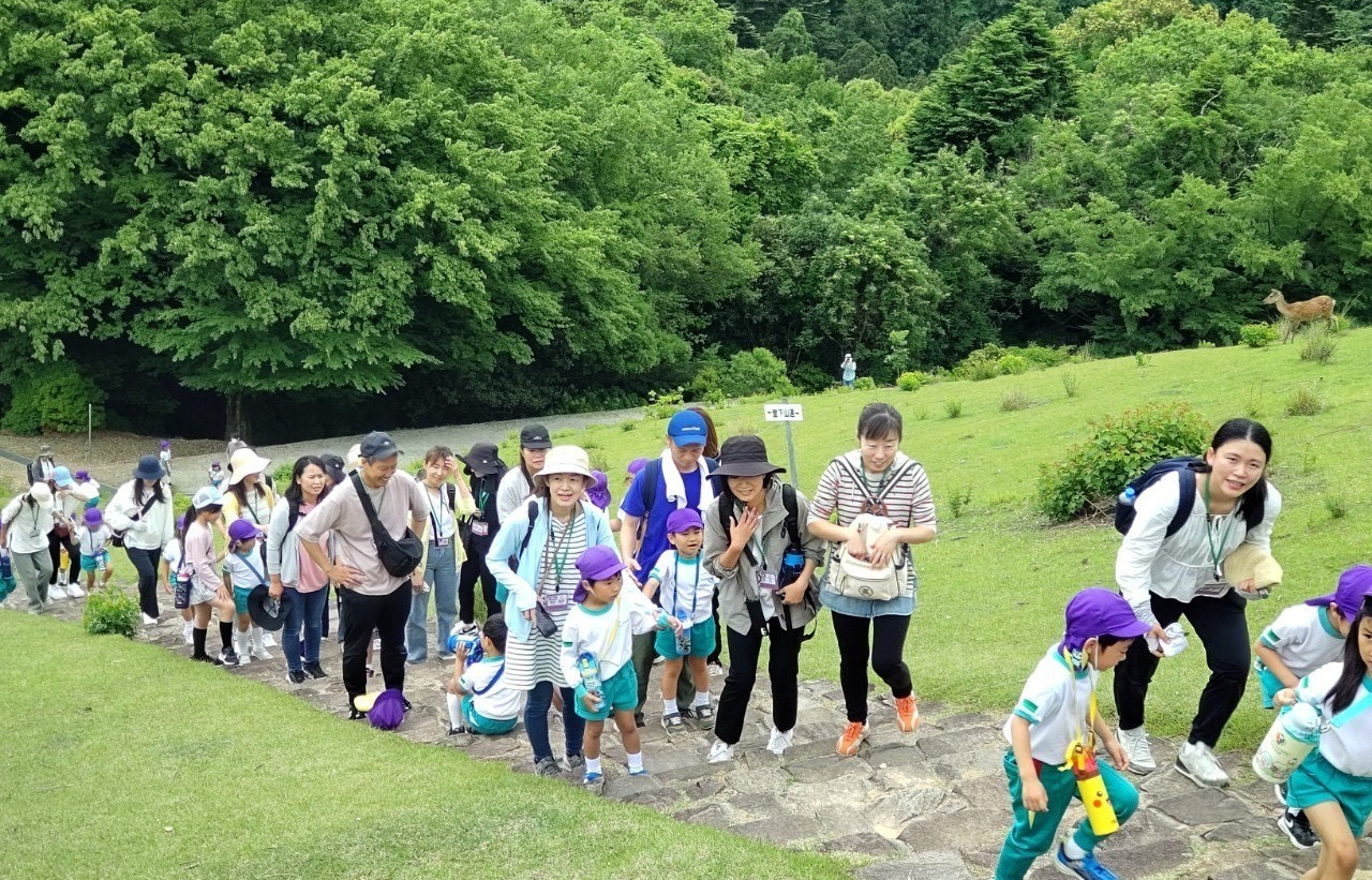 | 春の遠足(若草山・奈良公園) 親子で楽しい1日を過ごします。年長児(紫組)は、若草山一重目まで登山をします。また、年少児(赤組・桃組)は奈良公園まで散策し親子ゲームなどを楽しみます。 |