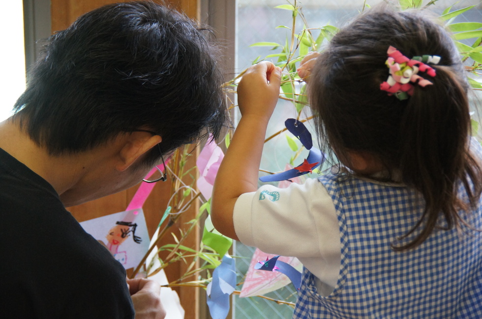 | 七夕参観 親子で笹に飾るものを製作します。園内にある竹林から採った笹に飾って家に持ち帰ります。 |