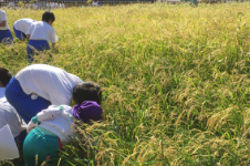 | 稲刈り 東大寺中学生との交流の2回目です。6月に植えた稲を刈り取ります。 |