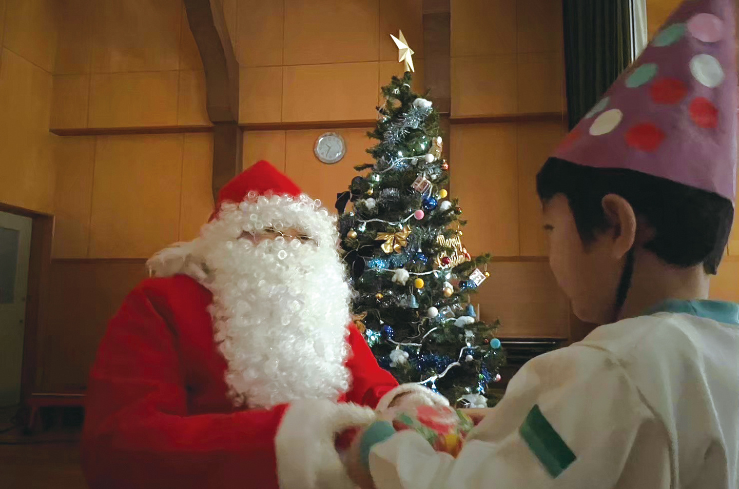 | クリスマス会 子ども達は、この年が楽しく過ごせたことを喜んで、歌を歌ったり一緒に遊んだりしたあと、サンタクロースからプレゼントを受け取ります。 |