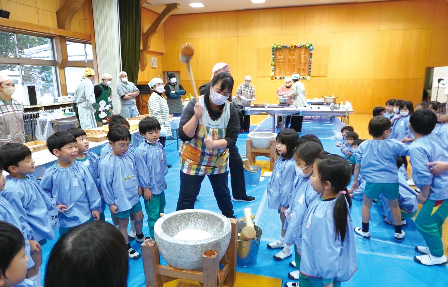 | お餅つき 年長組が秋に稲刈りをした餅米を使ってみんなでお餅つきをします。 |