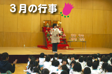 | ひなまつり 全園児がホールに集まり、歌を歌って楽しみます。保育者から雛飾りの説明を受けた後、クラス毎に記念撮影を行います。 |