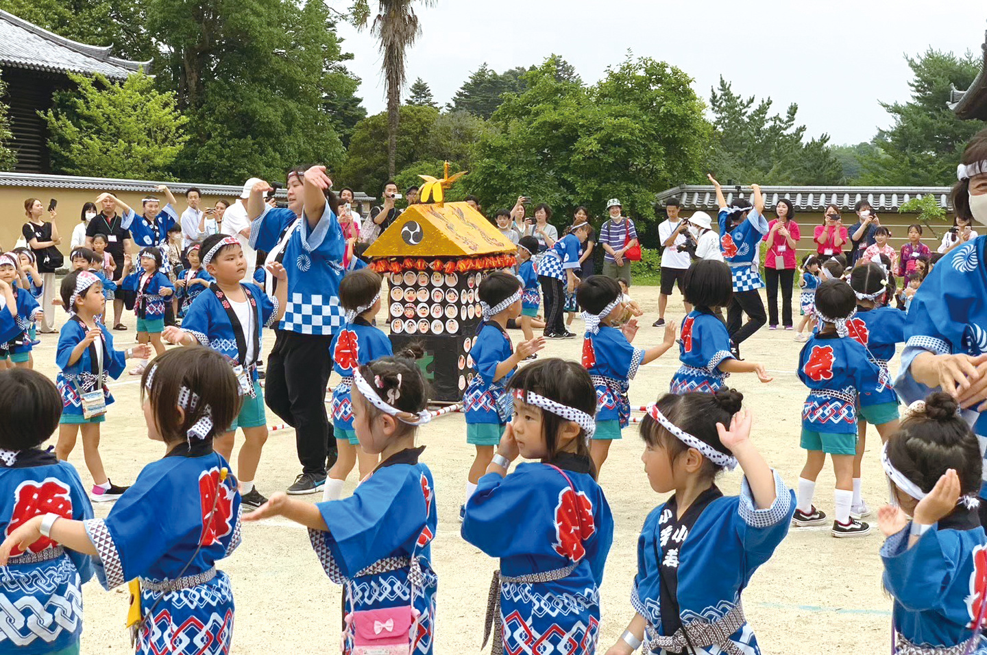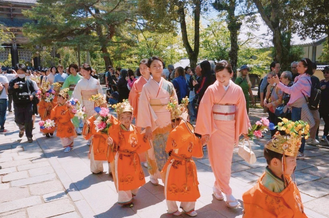 | 聖武祭 毎年5月2日、大仏さまを建立された聖武天皇の御命日を記念して行われます。東大寺の年中行事でも特に華やかなお祭りです。年長児を中心とした稚児行列が先導して歩きます。 |