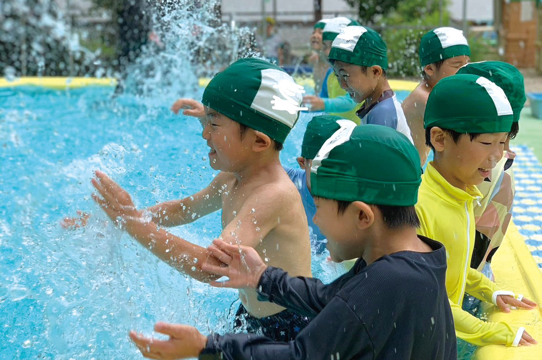 | プール遊び 園児達が大変楽しみにしている遊びの一つです。3歳児から順次内容を高めていくことによって、水に対する興味や慣れが次第に進み、個人差があるものの全員が、水に親しんで楽しく遊ぶことができるようになります。 |